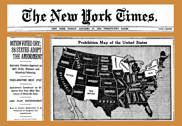 Upon the country’s entry into WWI, President Woodrow Wilson placed a temporary wartime prohibition on alcohol production, in order to save grain for food production. In 1917, Congress submitted the 18th Amendment. It was ratified in 1919 and officially put into effect federally in January 1920.