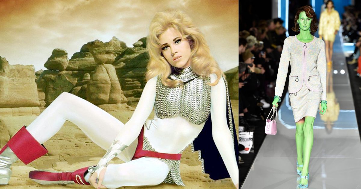 The 1968 space film Barbarella starring Jane Fonda exemplified this new obsession with all things intergalactic and set the standard for futuristic fashion. Barbarella showcases different costumes made of chain mail, molded plastic, and feathers — all of which became staple looks on the runways.