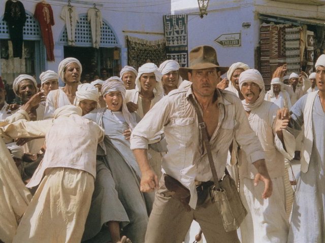 As well as coping with the intense heat, many of the crew — including Harrison Ford — were suffering from food poisoning. Exhausted and ill, Ford asked Spielberg if he could just take his gun out and shoot the man to get the scene over with. Spielberg loved the idea and the scene was filmed that way.