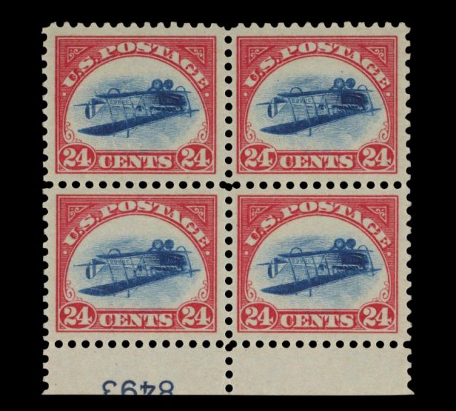 The last lot was a well-known stamp: the storied 24-cent Inverted Jenny Plate Block. Who was Jenny? A Curtiss JN-4 biplane, colored blue!
