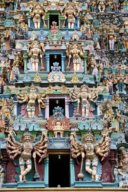 Each gopuram of the Meenakshi Temple is a multi-storied structure covered with thousands of brightly painted stone figures of animals, gods, and demons. These statues are repainted and repaired every 12 years.