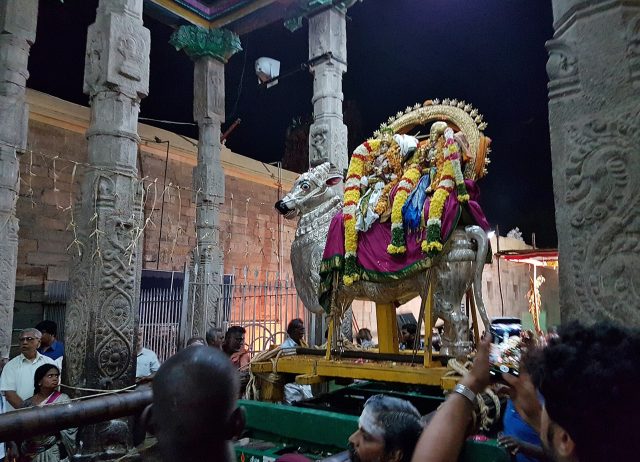 The shrines of Shiva and Meenakshi are in the heart of the temple complex. Because the temple is dedicated to their union, every evening, Shiva is carried in an elaborate ceremony to Meenakshi’s silver bed chamber before being returned to his own place at morning prayer the next day.