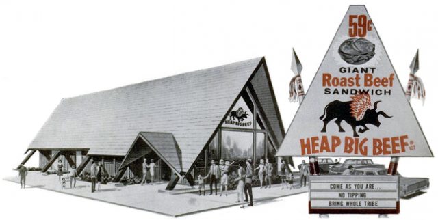 Before the term “casual discrimination” became part of day-to-day life, restaurants like Heap Big Beef were serving up tasty, yet questionable, fare. The Things Have Changed blog quotes from publicity: “You’ll let out a war-whoop when you sink your teeth into this delicious treat.”