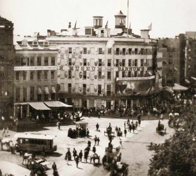 Barnum opened his American Museum at the corner of Broadway, Park Row, and Ann Street in lower Manhattan in 1841. The building had originally been Scudder’s American Museum. Under its new owner, the museum attracted around 15,000 visitors a day at 25 cents a time.