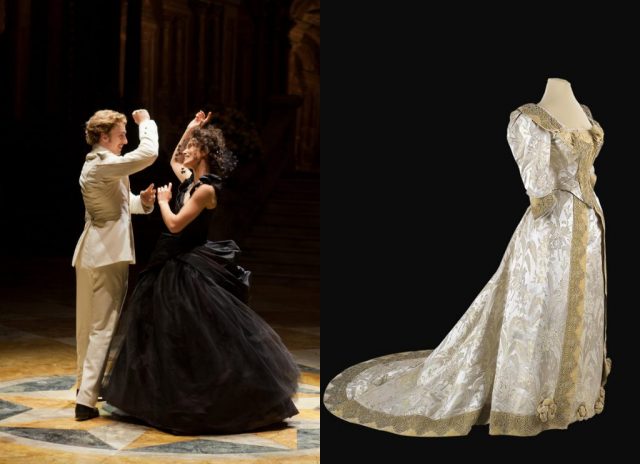 Anna Karenina (2012) follows the life of Russian aristocrat and socialite Anna Karenina in the 1870s. Here, Anna Karenina (played by Kiera Knightly) catches the eye of Count Alexei Vronsky (Aaron Taylor-Johnson) at a ball. Beside it is a style of dress that would be common at imperial balls in the late-nineteenth century. This particular dress was worn by Empress Maria Feodorovna in the 1890s.