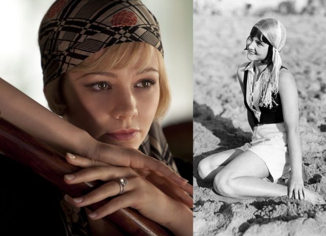 The Great Gatsby (2013) features a number of stunning period costumes from the 1920s, truly highlighting flapper fashion. In fact, the movie took home the Oscar for Best Costume Design at the 2014 Academy Awards. Here, Daisy Buchanan (played by Carey Mulligan) wears a headpiece commonly known as a “gypsy cap.” On the right is a young woman from 1929 also wearing a similar headdress.