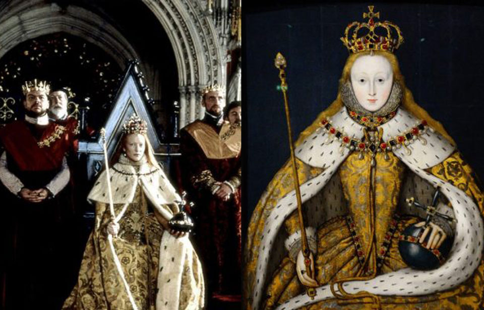 The portrait “The Coronation of Elizabeth” was used as inspiration for the coronation scene in Elizabeth (1998). On the left is the coronation scene in the movie compared to the painting that the costume was based on. The movie was nominated for Best Costume Design at the 1999 Academy Awards and won for best makeup.