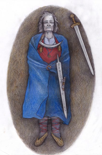 Jewelry suggested a high status, together with two swords: one without a hilt which rested on the body, and the other located above the deceased. So, this individual could have wielded weapons during their lifetime.
