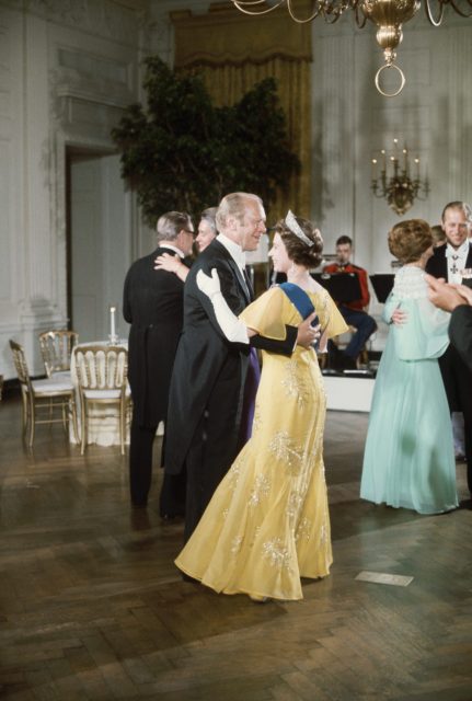 Queen Elizabeth went across the pond in 1976 shortly after the 200th anniversary of America’s Declaration of Independence from Britain to celebrate the continuing relationship between the two countries. She was welcomed with a state dinner hosted by President Gerald Ford and his wife Betty. According to Betty Ford’s memoir, “the Queen was very easy to deal with. If I hadn’t kept mixing up Your Highness and Your Majesty (he’s His Highness, she’s Her Majesty), I’d have given myself four stars for the way the visit went off.” Talk about a success!