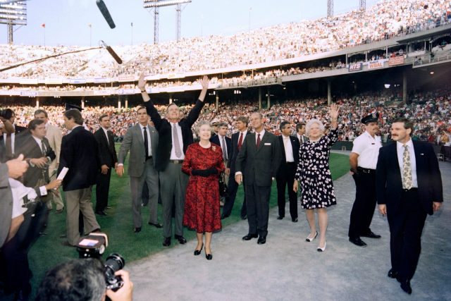 Two years later, the queen returned to America and was hosted by the Bushes. During this trip, President George H.W. Bush took the Queen and Prince Philip to a Baltimore Orioles vs. Oakland Athletics Major League Baseball game. This was the first time the Queen had ever been to a baseball game in her life.