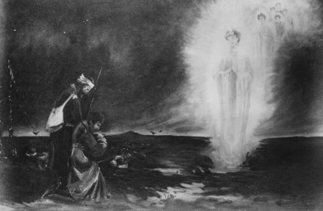 To try and quash the rumors, he published the story in a new book in 1915 entitled The Bowmen and Other Legends of the War. In his preface, he denies that “The Bowmen” was inspired by hearing of an actual angelic intervention at the battle. He clarifies that “all ages and nations have cherished the thought that spiritual hosts may come to the help of earthly arms” and adds that “Kipling’s story of the ghostly Indian regiment” was also on his mind.