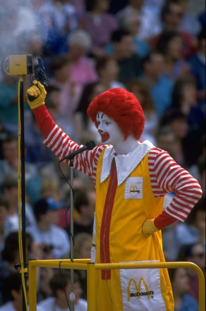 1993 Ronald McDonald Games. The starter has dressed up as Ronald McDonald and fires the starting pistol during the Games. (Photo Credit: Gray Mortimore/ Allsport/ Getty Images)