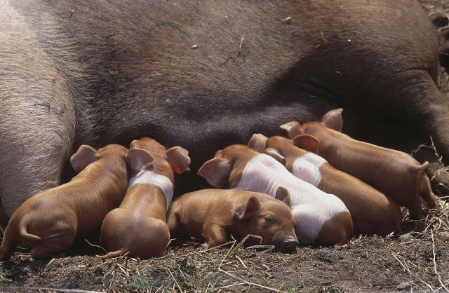 The flag of Denmark is red with a Nordic cross (two white lines – one horizontal, one vertical) on a red background. To get a “living flag,” the farmers crossbred breeds such as the Holsteinian and Jutlandian marsh pigs, the English Tamworth pig, and red variants of the Angein Saddleback.