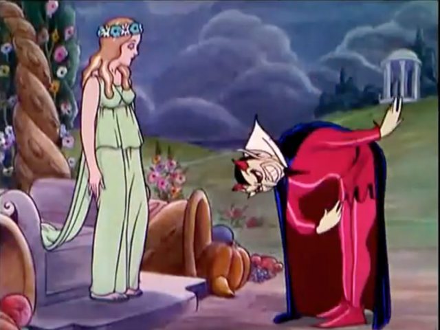 There are many similarities between Disney’s first princess, Persephone, and Snow White, from the way she holds her skirt and twirling to her tendency to surround herself with adorable animals and creatures. Because Persephone was one of Disney Studio’s first attempts with human characters, animators struggled to capture realistic aspects of a female human entirely. For example, in the opening dance, Persephone’s arms appear more elastic than elegant, resembling a sort of animated rubber hose.