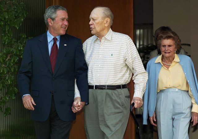 Noted for his integrity by some, he also attracted criticism for pardoning Richard Nixon. He died in 2006. The image is from April that year. Holding his hand is the then-POTUS George W. Bush (43rd president, 2001 – 09).