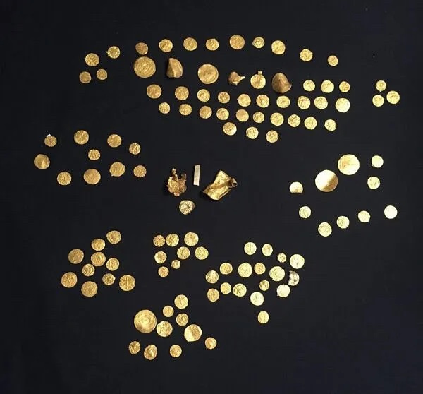 The objects were buried shortly after the year 600 AD. Most of the coins are Frankish tremisses- a small gold coin that was used in Late Antiquity. Nine gold solidi have also been uncovered. Solidis are larger gold coins from the Byzantine empire, worth three tremisses. The trove also contains four other gold objects – a gold bracteate (a type of stamped pendant), a small gold bar, and two other pieces of gold that were likely parts of jewelry.