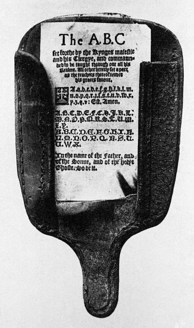 Despite its misleading name, a hornbook wasn’t a book at all but a board used to help children learn the alphabet, numbers, and the Lord’s Prayer. The information would be written on paper, attached to a board made of wood or leather, and then a thin layer of transparent horn was fitted over the top to prevent damage to the paper. It could then be used for generations of children over and over again.