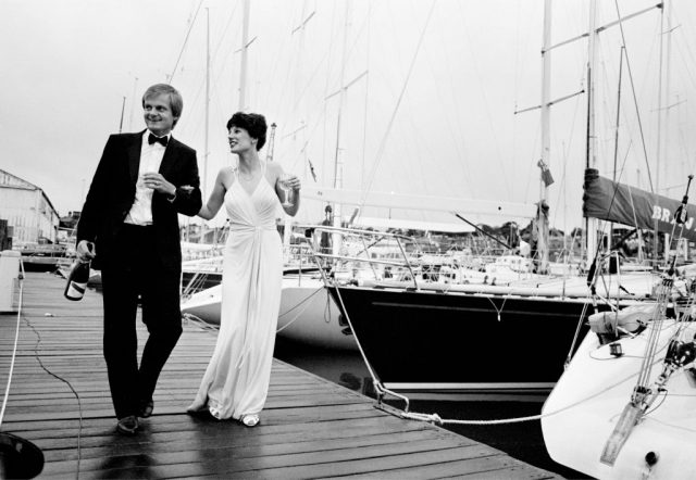 This pair are still not done celebrating the morning after the annual Cowes Week Ball in the Isle of Wight in August 1986.