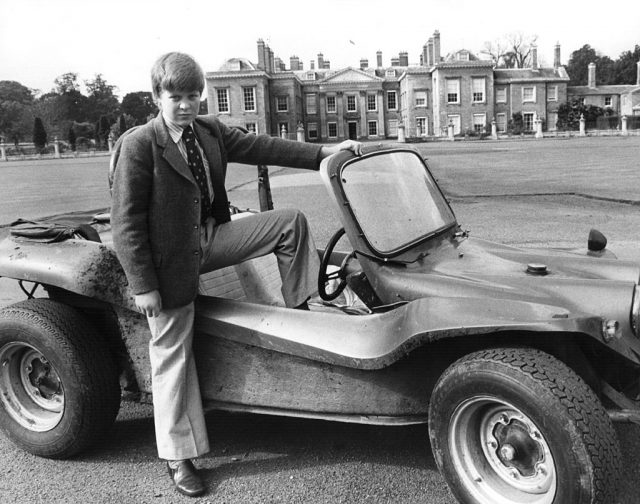 Thirteen-year-old Charles Spencer, the younger brother of Princess Diana, with his beach buggy outside his home in 1977.