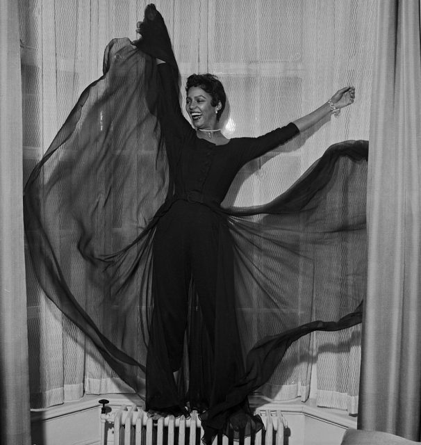 American actress and singer Dorothy Dandridge strikes a pose while standing on a radiator in a bay window in 1956.