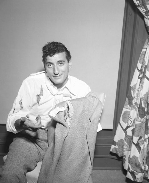 Tony Bennett was discovered in 1949, and by 1950 had signed a contract with Columbia Records. His first big hit was the song “Because of You,” which reached number one on the pop charts in 1951. His other early hits include “Cold, Cold Heart” and “Rags to Riches.” Younger fans especially loved Bennett. Here he is pictured after being mobbed by high-school girls in 1952.