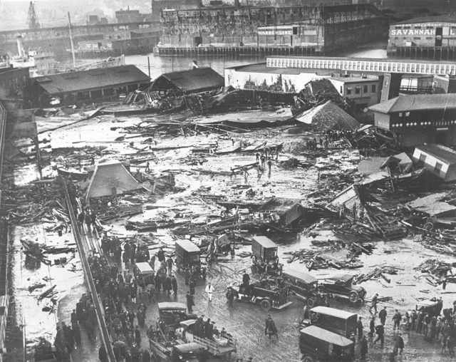 Two million gallons of molasses were released, and it formed a 15-foot-high and 160-foot-wide wave that traveled at 35mph. Streets for two blocks were flooded around two to three feet deep. Such was the force of the wave that buildings were crushed, and even the solid steel supports of the nearby elevated train platform were swept away.
