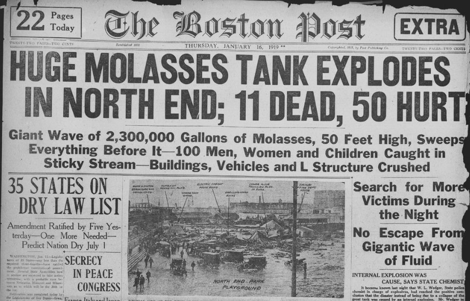 A fresh delivery of molasses was made to Commercial Street on January 14, 1919. Molasses has to be warmed for transport to make it less viscous, leading some to think that adding new, warm molasses to older, cold molasses added extra pressure to the already pretty unstable tank, which burst around lunchtime on January 15, 1919