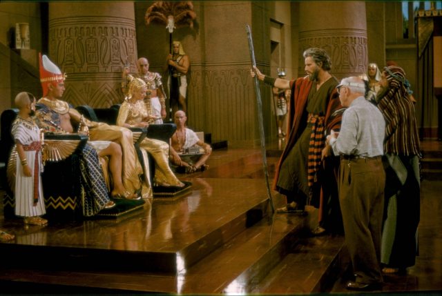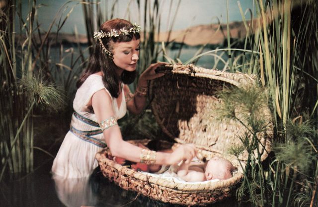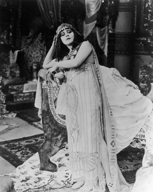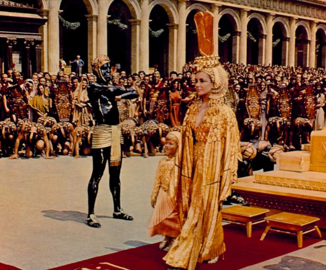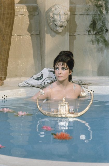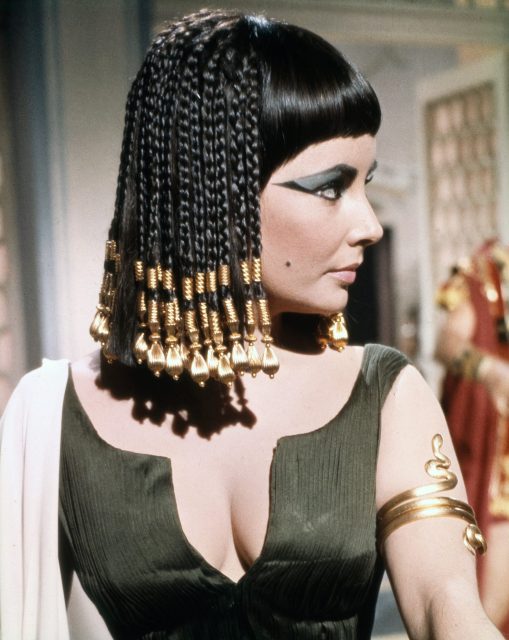 In Cleopatra, Liz Taylor wears dramatic eyeliner with colorful eyeshadow that makes her blue eyes really pop. A similar sort of eyeliner can be seen in ancient Egyptian hieroglyphics. Both men and women in ancient Egypt frequently wore eye makeup as they thought it helped repel flies, protect the eyes from the sun’s rays, and ward off infections.