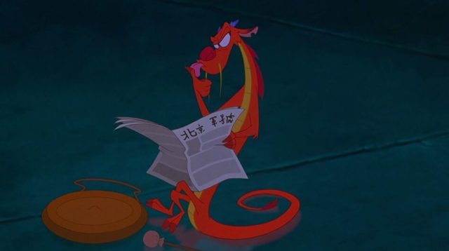In Mulan, Mushu is seen reading a newspaper from right to left, rather than left to right as English-speakers do. Traditional Chinese text was written in vertical columns that were meant to be ready from right to left.