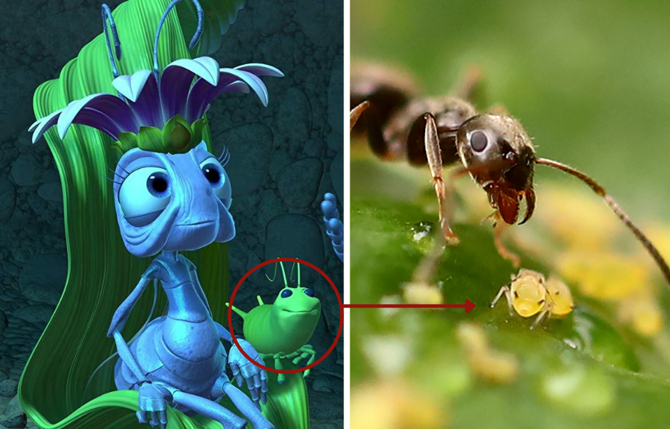The Queen Ant in A Bug’s Life is often seen accompanied by her ‘pet’ named Aphie. In real life, there are bugs that are known as aphids that live in harmony with ants. Aphids suck nectar out of plants and use it as fuel. So in reality, aphids are not really like pets for ants, but more like cattle that they farm. The more you know!