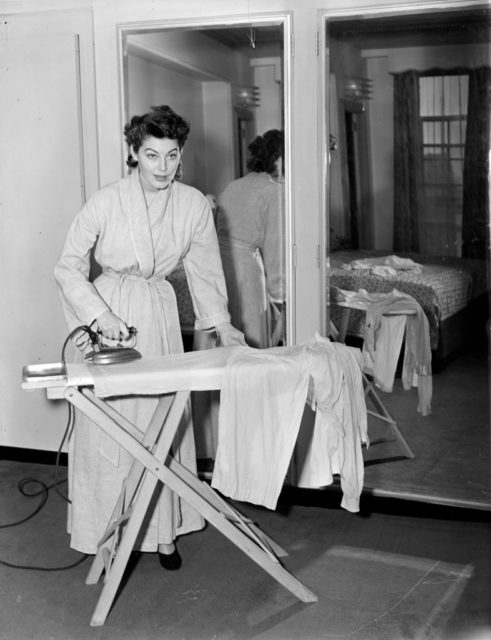 Film actress Ava Gardner is just like everyone else! Here we see her taking a break from all the glitz and glamour of Hollywood to iron her pajamas at home.