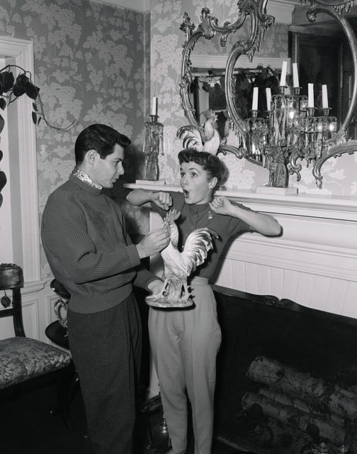 Singer Eddie Fisher and actress Debbie Reynolds goofing around at their home in Pacific Palisades, circa 1955. Fisher had recently signed a long-term contract with NBC and RCA Victor, while Debbie Reynolds had just wrapped up The Catered Affair with MGM.