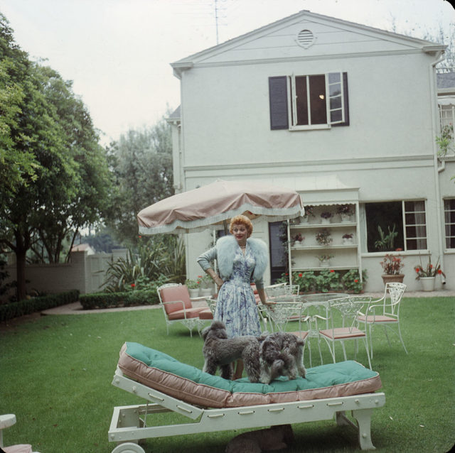 This is actress, comedian, and dog mom Lucille Ball playing in the backyard of her home in Los Angeles with her two puppies in the late 1950s.
