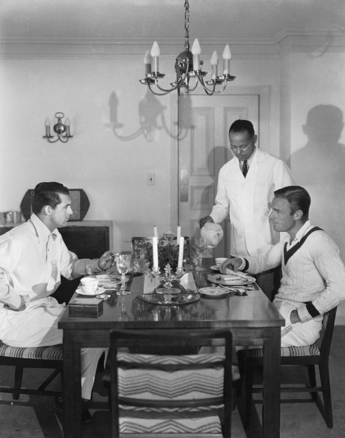 Cary Grant and actor Randolph Scott lived together on and off for 12 years. At the time, their home was jokingly referred to as “Bachelor Hall.” However, rumors suggest that the two actors were more than friends while they lived together. Here they are having tea at their beach house in Malibu in 1935 after Grant separated from Virginia Cherrill.