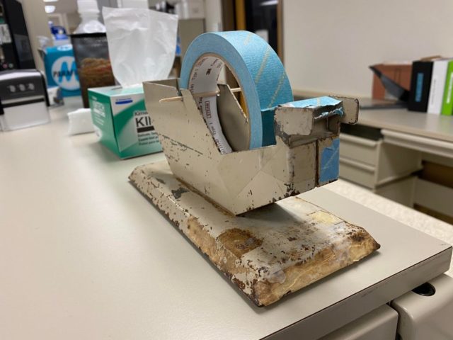 This heavy-duty tape dispenser must be irreplaceable because it is currently being held up by a toothpick. Reddit user Squaragus_Asparagus works in a multimillion-dollar hospital lab, and revealed that they still rely on this tape dispenser from the 1960s-1970s.
