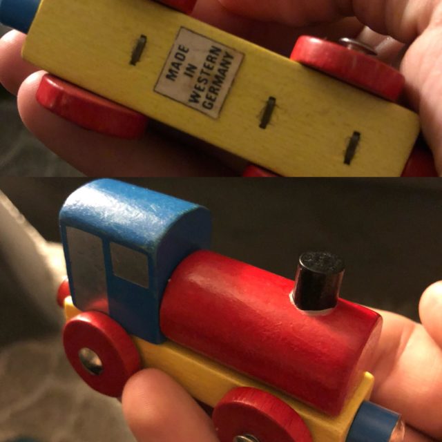 This train toy was made in West Germany at some point before West and East Germany were reunited. Since Germany became unified in the 1990s, this toy has an interesting history lesson attached to it for curious children!