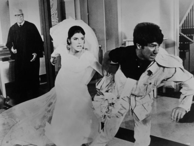 Spoiler: At the end of The Graduate, Benjamin (Hoffman) escapes the shadow of Mrs. Robinson (Anne Bancroft), famously interrupting Elaine (Katharine Ross)’s wedding to run off with her.