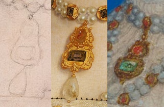 Historically, this miniature has been linked to Howard because it dates to 1540, when Catherine Howard married Henry VIII. The unknown woman’s jewelry also seems to be similar to the jewelry found in Catherine Howard’s inventory. The woman in the painting seems to be wearing a pendant that once belonged to Jane Seymour, Henry VIII’s third wife, so we know that Henry VIII had a habit of regifting his previous wives’ belongings to his later wives.