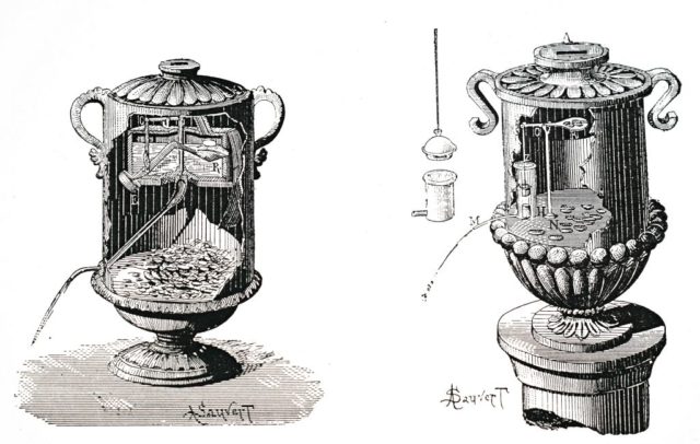 The vending machine was devised specifically for temples to solve a recurring problem, “people were taking more Holy Water than they were paying for.” At the cost of one five-drachm coin, this problem was quickly solved.