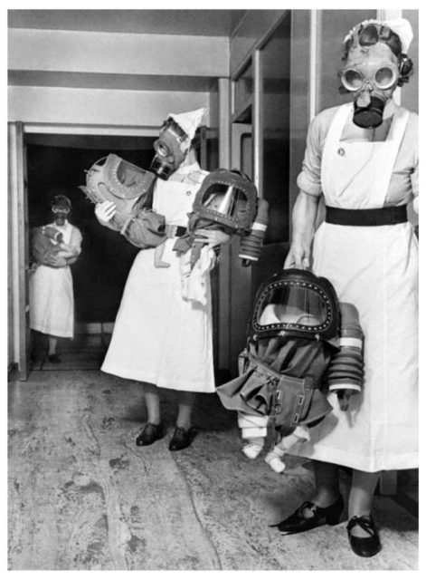 Throughout World War II, the threat of chemical warfare frightened citizens and soldiers across Europe. To prepare for a possible gas attack, civilians could have protected themselves with gas masks. But what about children and infants who were too small to wear a conventional mask? This eerie 1940 photograph shows nurses testing out new “gas masks” for babies.