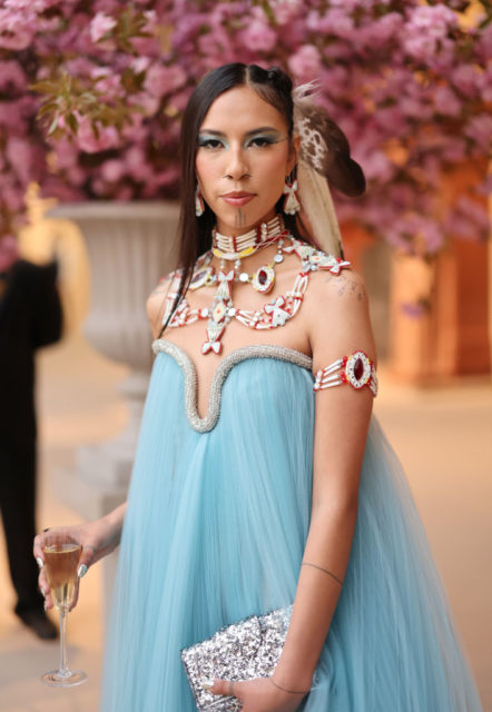 Indigenous model and activist Quannah Chasinghorse stunned in a Prabal Gurung gown and traditional jewelry made by Antelope Woman Designs. Chasinghorse traces her ancestry to the Hän Gwich’in and Oglala Lakota Nations of Alaska, Canada, and South Dakota. The balance of modern and traditional elements in her look speaks to how Indigeneity would have been represented in the Gilded Age as many Indigenous peoples were forced to assimilate into Western society. Chasinghorse’s effortless red carpet look brings empowering representation for many Indigenous women and girls today,
