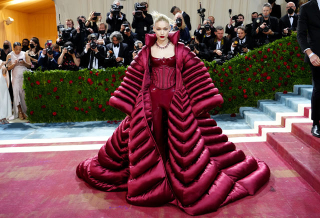 Model Gigi Hadid wore this oversized Versace puffer coat over fitted latex pants and a matching corset top – and it’s really giving us maroon Michelin Man vibes. The corset is the only on-theme element of this matching ensemble, but unless the theme was Canada-chic why wear a winter jacket to the soiree of the season?