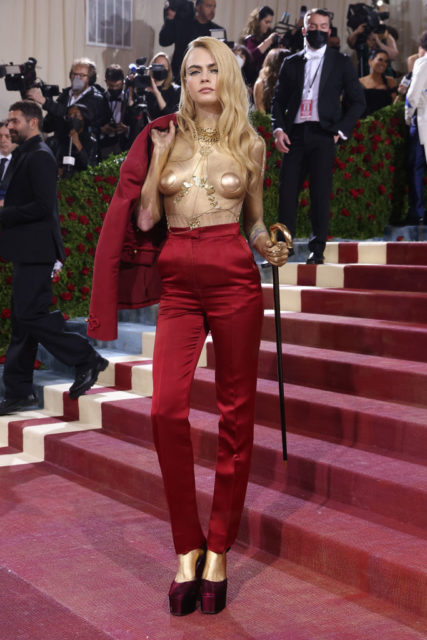 Actress and model Cara Delevingne took the “gilded glamour” theme a bit too far, and maybe a bit too on the nose. Head to toe in Dior Haute Couture, Delevingne’s menswear-inspired look complete with a cane and a formal waistcoat with tails that looked surprisingly laid back the star – who is no stranger to challenging the fashion norm. But boy were we wrong once that coat came off to reveal a ton of gold body paint. Maybe not the best look of the night, but Delevingne wins extra points for braving the red carpet topless!