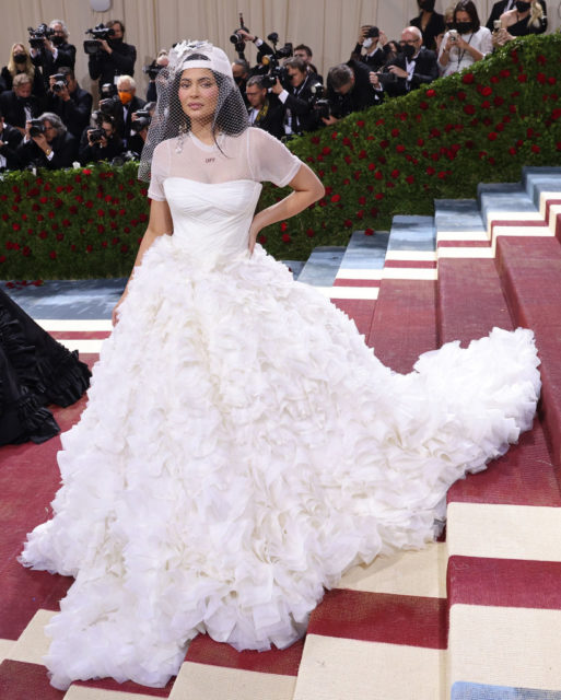 From the neck down, Kylie Jenner’s custom Off White gown seems like a great fit for this year’s Gala theme. The ruffled skirt with a long train and fitted corset top are reminiscent of popular silhouettes of the Gilded Age, but the glamourous gown mixed with the strange athleisure elements of the mesh t-shirt and backward baseball cap is anything but a home run.
