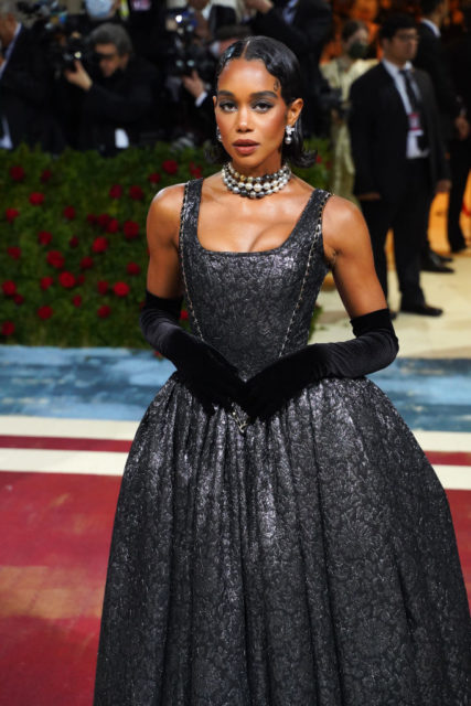 Actress and model Laura Harrier donned a custom H&M gown for her fourth Met Gala. The black and silver gown with corsetted bodice paired perfectly with black velvet opera gloves to deliver a rich and opulent take on “gilded glamour.”