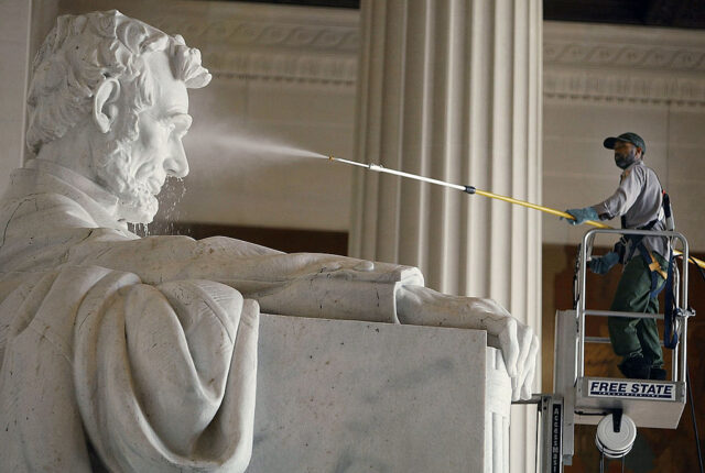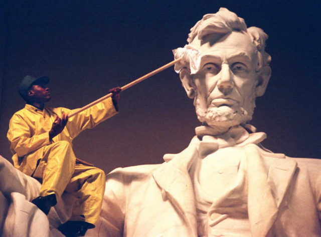 While it might seem a little undignified, the marble version of President Lincoln gets cleaned with a powerful pressure washer twice a year. Even his ears receive a good cleaning with specially made cotton swabs, to get out all the bird droppings and bugs that accumulate over the months.