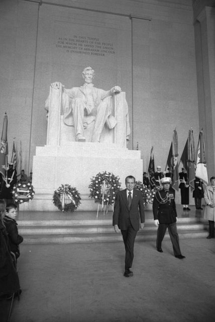 Sites such as the Lincoln Memorial became common gathering spots for protests as opposition to the Vietnam War heated up. A few days after the May 1970 shootings at Kent State University, a protest and candlelight vigil were held at the monument. They lasted late into the night and attracted the notice of President Richard Nixon, who watched the event from the White House.