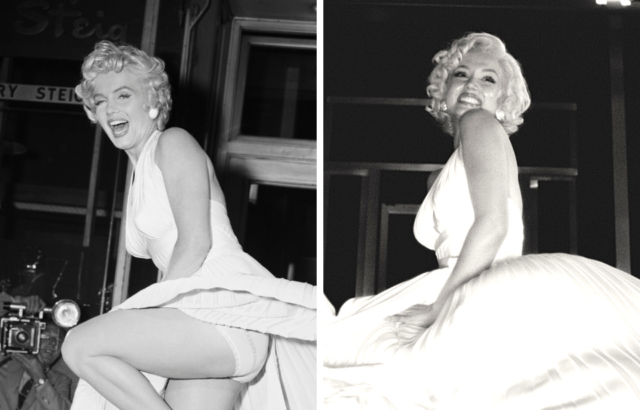 Above, de Armas is seen absolutely nailing the body language that Monroe used when the grate blew wind underneath her white halter dress. From the earrings to the curls, the two look like twins.