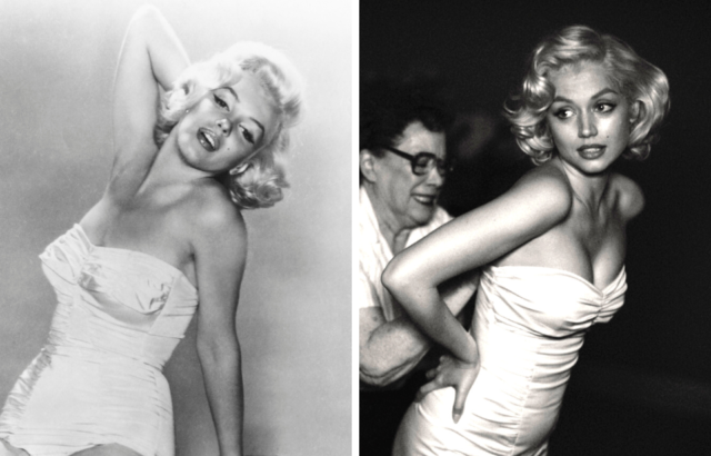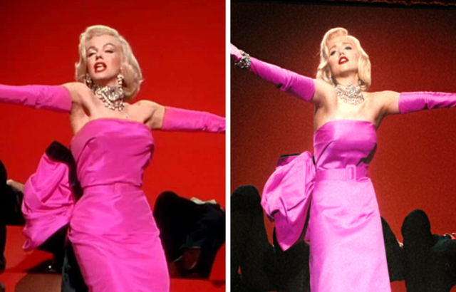 De Armas’ depiction of Monroe during the 1953 film, Gentlemen Prefer Blondes, is almost impossible to differentiate from the original. The dress, the jewelry, and even the expressions on their faces are eerily similar.