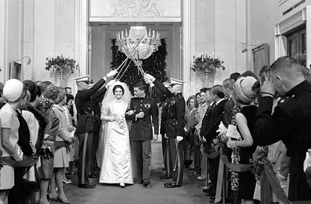 President Lyndon Johnson and First Lady Claudia “Lady Bird” Johnson’s daughter Lynda Bird Johnson was married to Captain Charles S. Robb in the East Room of the White House on December 9, 1967, marking the 15th White House wedding. Fellow White House bride Alice Lee Roosevelt was one of the 500 guests who attended the ceremony.